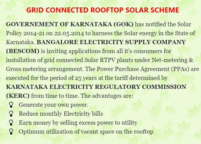 Bengaluru: Bescom launches Rooftop solar scheme Leave a reply Generate your own power.Reduce monthly Electricity billsEarn money by selling excess power to utilityOptimum utilization of vacant space on the rooftop Share this: Click to share on X (Opens in new window) X Click to share on Facebook (Opens in new window) Facebook Click to email a link to a friend (Opens in new window) Email Click to share on Reddit (Opens in new window) Reddit Click to share on Pinterest (Opens in new window) Pinterest Click to share on WhatsApp (Opens in new window) WhatsApp Click to share on Telegram (Opens in new window) Telegram Like Loading... Related Pages: 1 2