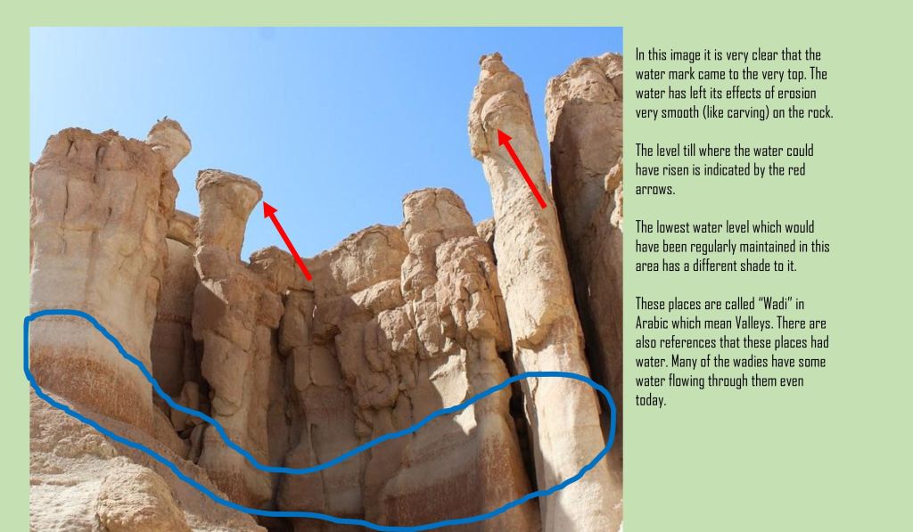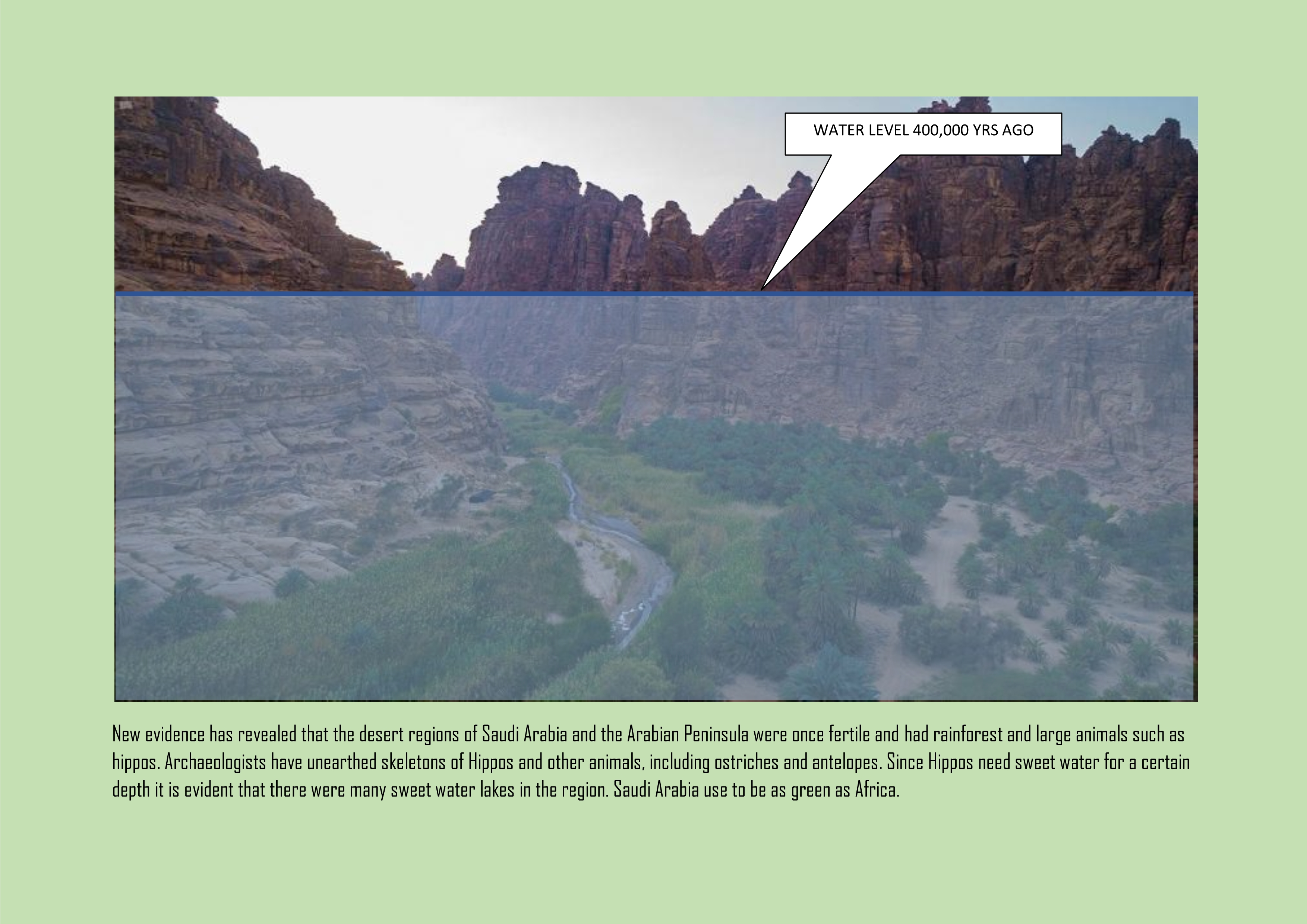 Since Hippos need sweet water of a certain depth it is evident that there were deep sweet-water lakes in the region. There were not few but many such lakes. Saudi Arabia use to be as green as Africa once was. Today even Africa is slowly turning into a desert.