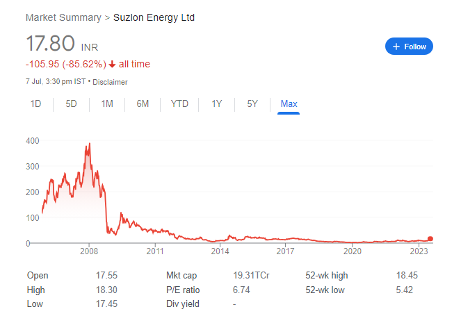 In 2007 Suzlon had reached its pinnacle and was the 5th largest Wind Energy company in the entire world and its share price was Rs 459.