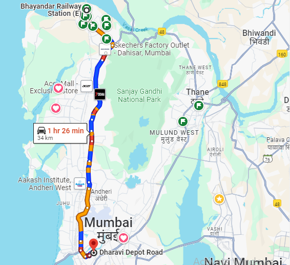 C-72 or A-72 starts from Bhayandar Railway Station (Virar End) on the east side and travels right past Sion Station to Dharavi Depot (34 Kms) taking approximately 2hrs. When there is traffic add half an hour. When there is no traffic reduce half an hour.