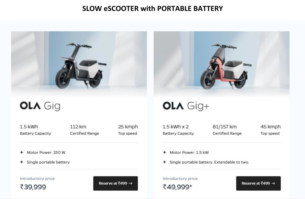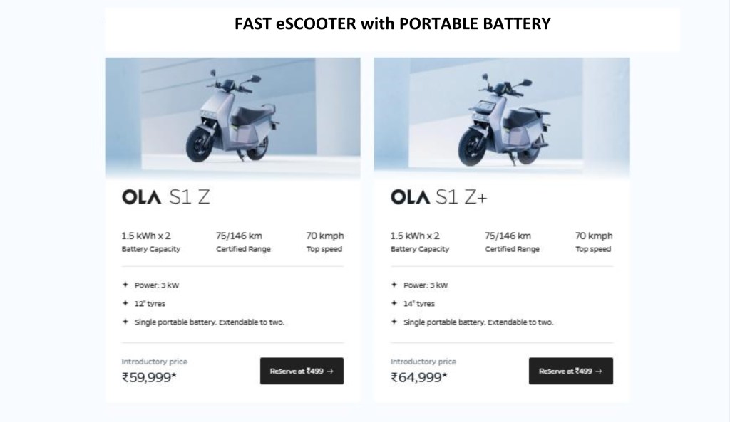 This year Ola Electric too introduces multiple electric scooter with portable batteries. It has come with portable batteries for both slow speed scooter and the fast electric scooter called Ola 1 Z and 1 Z Plus.