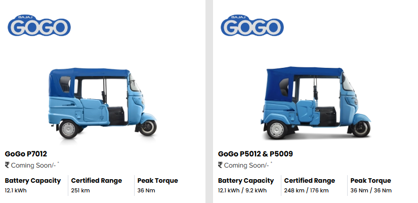 बजाज गोगो रिक्शा एक इलेक्ट्रिक थ्री-व्हीलर है जिसे शहरी परिवहन के लिए डिज़ाइन किया गया है। यह दो वेरिएंट में उपलब्ध है, जिसकी कीमत ₹3.27 से लेकर ₹3.83 लाख तक है। यहाँ कुछ मुख्य विशेषताएं दी गई हैं: