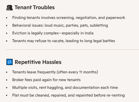 - Financial drain: While the case drags on, you lose rental income but still pay property tax, society charges, and maintenance. You may also need to hire a lawyer and attend multiple hearings.