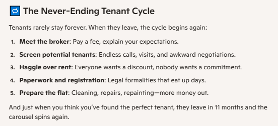 The emotional labor, hidden costs, and constant involvement make it one of the lowest ROI investments—especially when compared to truly passive avenues like stocks.