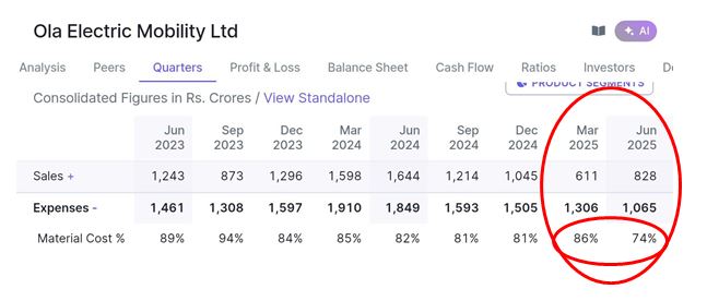 Material costs make up more than 80% of OLA’s EXPENSES… if this reduces it’s chances of Profitability INCREASES. Material Expenses seems to have started reducing since June 2025.. came down 12%… to 74% from 86% in March. It will keep increasing with time… Since Ola makes everything in-house it has this advantage… It’s RIVALS who just assemble 2-wheelers will not have this advantage.