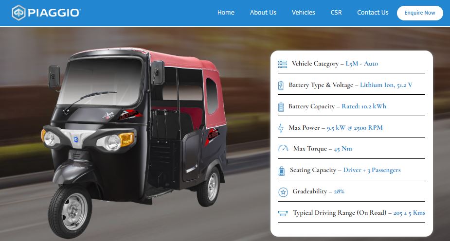 We have picked the top 5 companies manufacturing Electric Auto Rickshaws for you. Most of them are priced around Rs 3,00,000 with approx. top speed around 50 kmph and recharging time of around 5 Hrs. They also have good informative websites with Piaggio having the best website.