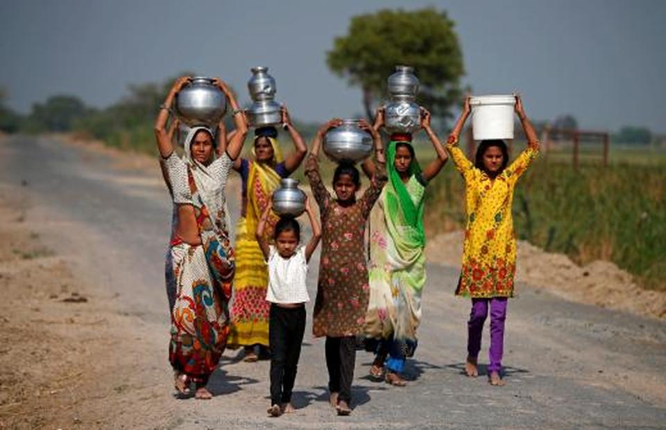 Village women and girls carry water at Fangadi Village on the outskirts of Ahmedabad